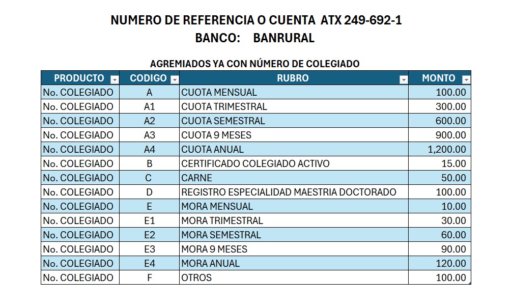 Imaginemos que su número de colegiado es el 87, entonces pagamos una cuota: deberá dar al receptor el código 87A, luego para pagar el carné: deberá dar el código 87C y para los dos certificados: el código 87B1.